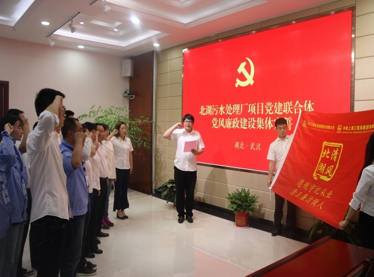當天下午,武漢北湖污水處理廠項目黨建聯(lián)合體舉行了“清風北湖”黨風廉政建設主題活動啟動儀式。首先進行廉潔從業(yè)承諾宣誓,北湖項目黨建聯(lián)合體各成員單位共20余名黨員在黨徽下共同進行了莊嚴宣誓,均表示要自覺遵守紀律法規(guī),帶頭改進工作生活作風,自覺潔身端行,絕不以權謀私。宣誓結束后,聯(lián)合體各方代表共同簽訂了工程建設廉潔共建協(xié)議書,明確了各方廉潔共建責任及在工程建設過程中應遵守的廉潔從業(yè)要求。最后,與會領導人員分別簽訂了廉潔從業(yè)承諾書,項目黨建聯(lián)合體全體黨員集體手抄《中國共產(chǎn)黨廉潔自律準則》,進一步加強了項目黨員職工黨性紀律及廉潔自律意識。