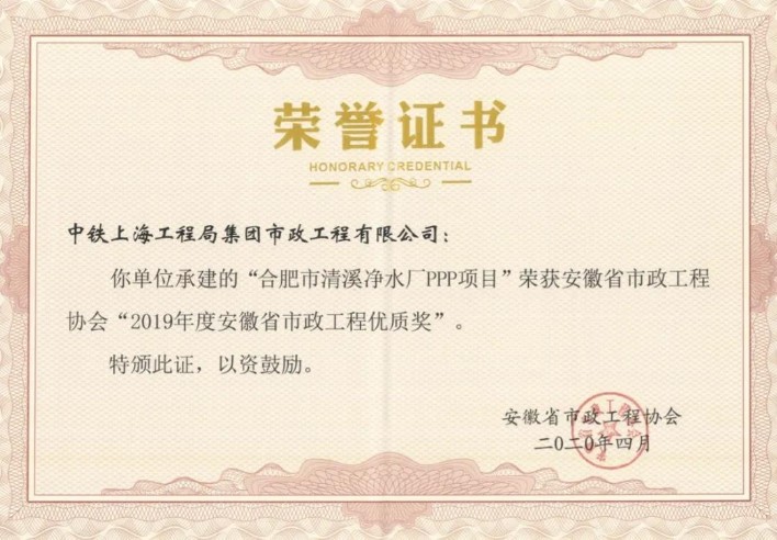 近日,安徽省市政協(xié)會傳來喜訊,公司承建的合肥市清溪凈水廠PPP項目榮獲安徽省“市政工程優(yōu)質獎”。