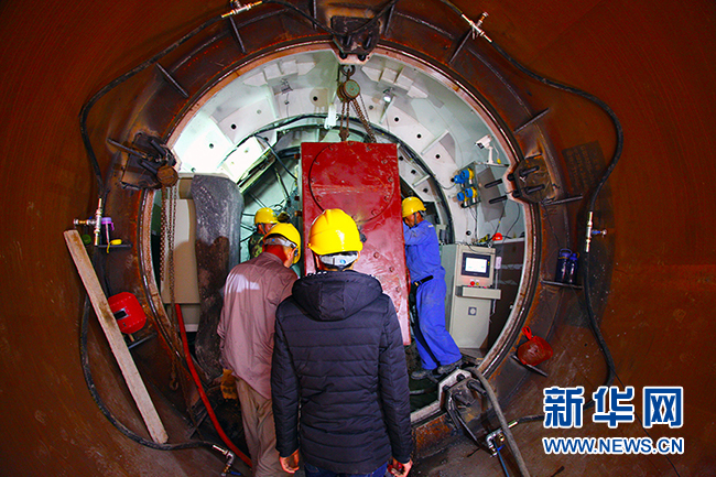 圖為施工人員在頂管管道頂端做準(zhǔn)備工作。