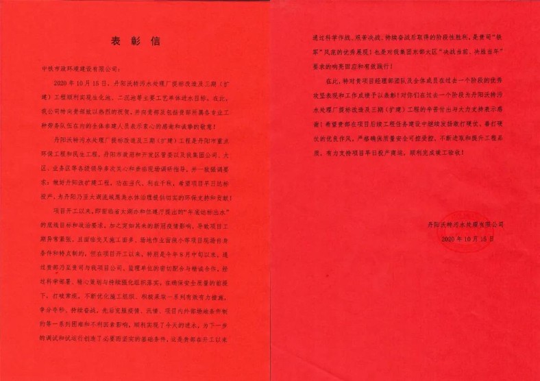 公司丹陽沃特污水處理廠提標(biāo)改造及三期(擴(kuò)建)工程項(xiàng)目部與丹陽沃特污水處理有限公司、監(jiān)理單位密切配合、精心策劃,持續(xù)強(qiáng)化組織落實(shí),先后克服疫情、汛情、項(xiàng)目內(nèi)外部場地條件制約等困難,于10月15日順利實(shí)現(xiàn)生化池、二沉池等主要工藝單體進(jìn)水目標(biāo),充分展現(xiàn)了市政“鐵軍”風(fēng)采。為此,丹陽沃特污水處理有限公司特發(fā)表彰信至公司,表示衷心感謝和誠摯敬意。