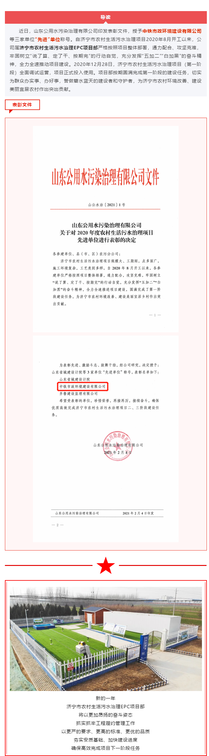 濟(jì)寧市農(nóng)村生活污水治理EPC項目部再添新譽