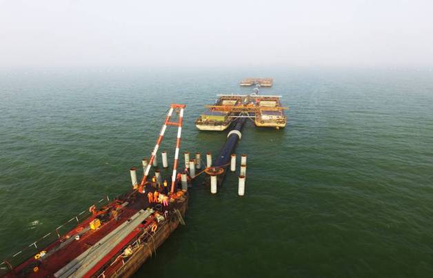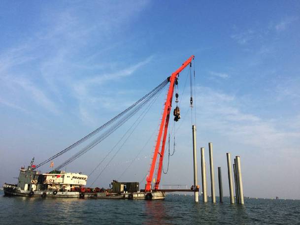 此次建設(shè)者們面對(duì)的是直徑2.6米,沉管長(zhǎng)度228米,水深超過(guò)20米的水下鋼管鋪管施工,因?yàn)槠涑笾睆?、超長(zhǎng)沉管、超深水域的特點(diǎn),被業(yè)界稱(chēng)為國(guó)內(nèi)最深水下鋪管工程,施工難度極大。項(xiàng)目開(kāi)工之后,建設(shè)者們就遇到第一個(gè)難題,水下沉管首先需要在平均深度達(dá)到20米的湖底打下93根鋼管樁,以3根為一橫排,豎排31根要保持在一個(gè)直線(xiàn)上,以便水下沉管固定安裝。由于水深關(guān)系,以現(xiàn)有彈簧振動(dòng)樁錘或者液壓式?jīng)_擊錘,難以達(dá)到深水樁基進(jìn)度要求,為此,建設(shè)者們創(chuàng)新研制了新型深水樁基送樁器,其本體由上、下兩部分組成,上部分采用上部鋼管,在所述上部鋼管的外表面由上至下標(biāo)有刻度尺,用于控制貫入度及施打深度;下部分采用下部鋼管,上下兩部分通過(guò)上下部分連接件銜接,分別與上下部分鋼管焊接,在與上下部分焊接部位沿著鋼管周側(cè)等間隔設(shè)有若干加勁板。 通過(guò)新型深水樁基送樁器使用,保證了深水打樁垂直度、貫入度、樁頂標(biāo)高。