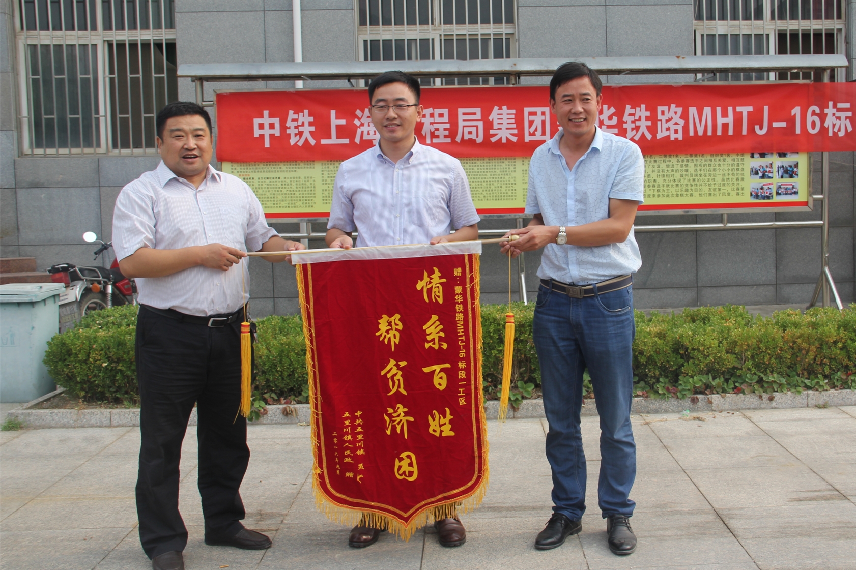 9月18日,來自河南省盧氏縣五里川鎮(zhèn)19個貧困村的143個貧困戶齊聚鎮(zhèn)政府,領(lǐng)取了由蒙華鐵路16標(biāo)一工區(qū)援助的5000只脫貧致富雞苗。該工區(qū)項目黨支部積極參與地方“精準(zhǔn)扶貧”,彰顯央企社會責(zé)任,與當(dāng)?shù)劓?zhèn)黨委、政府建立了良好的溝通交流機(jī)制,同時與當(dāng)?shù)卮迕窠⒘撕椭C、穩(wěn)定的良好關(guān)系。圖為縣政府代表和鎮(zhèn)黨委書記為一工區(qū)獻(xiàn)錦旗。